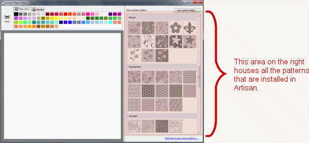 You can also use your own images for patterns. Above the pattern browser is button labelled 'use custom image...'. Click this, find the file you wish to use, and then click 'open'. Please note that the included patterns, as well as the downloadable ones are designed specifically for Artisan. Using a custom image may not look as you expect.