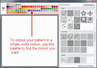 Colours are chosen from the colour bar at the top. If you want to see what your chosen pattern looks like in a particular colour, hover your mouse over the colour. Once you have found a colour you like, click on it to select it.